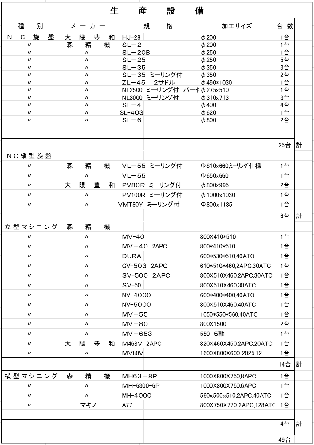 大型φ1000~小型の設備一覧